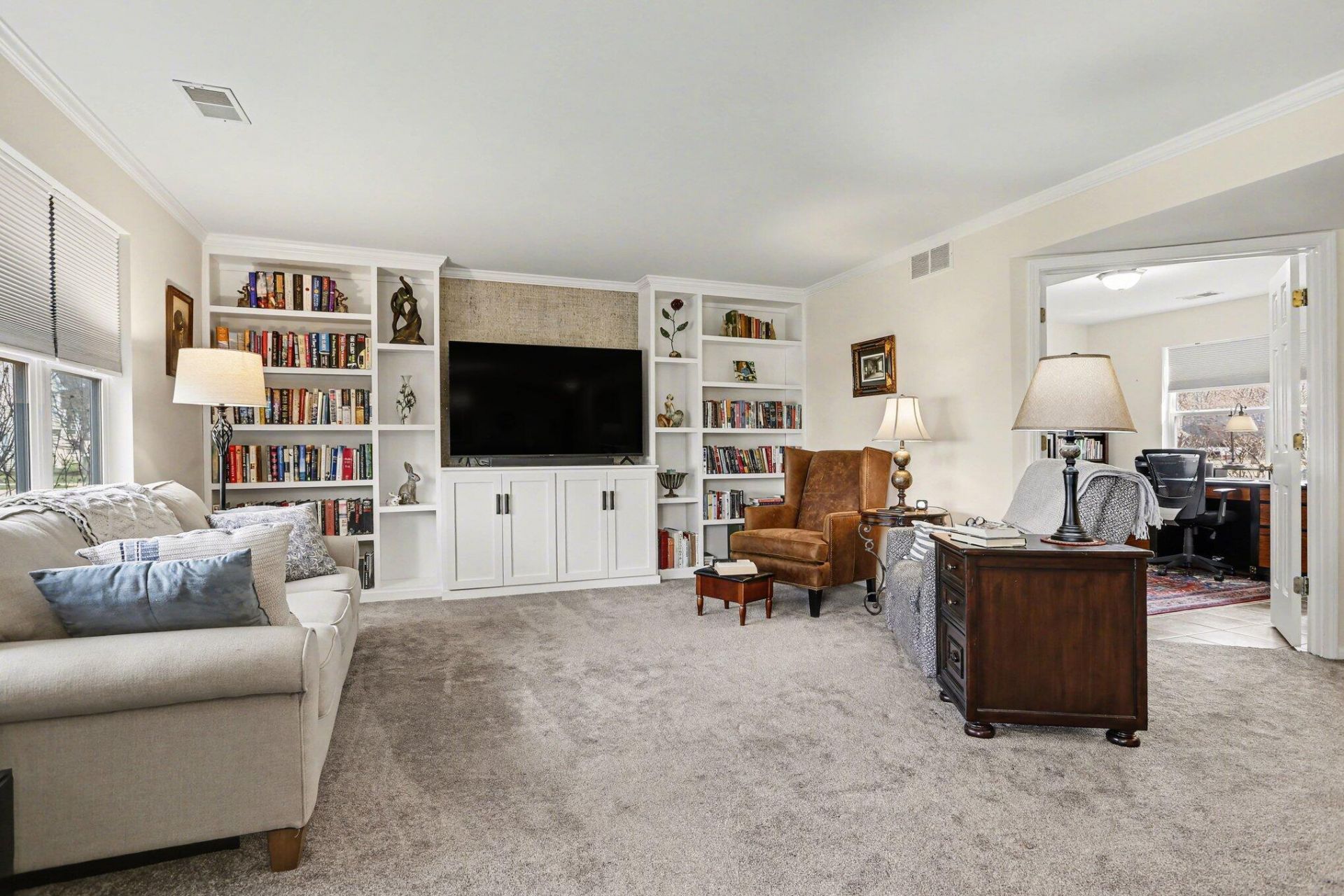 Enjoy maintenance-free condo living in this beautifully updated 2-bedroom, 2-bath main-floor unit in desirable Fieldstone Village. The bright kitchen features white cabinetry, stainless steel appliances, and quartz countertops, which flow to the dining and living areas, ideal for everyday living and entertaining. The living room showcases new built-ins on the TV wall and warm, neutral wallpaper accents. A flexible office/den provides the perfect space for a home office, TV room, craft area, or playroom. The primary suite includes a walk-in closet and an ensuite bath with tub, separate shower, and quartz countertops. A second bedroom, full bath, and convenient in-unit laundry complete the floor plan. Step outside through the doorwall to a covered patio, or enter through the covered front porch, both perfect for relaxing outdoors. Recent updates include newer mechanicals, fresh paint throughout, new carpet, updated appliances, window treatments, and built-in bookshelves. Fieldstone Village amenities include an inground outdoor pool. Ideally located near downtown Chelsea, enjoy restaurants, shops, the library, Purple Rose Theatre, and coffee shops, with quick access to I-94 and M-14 for commuters.