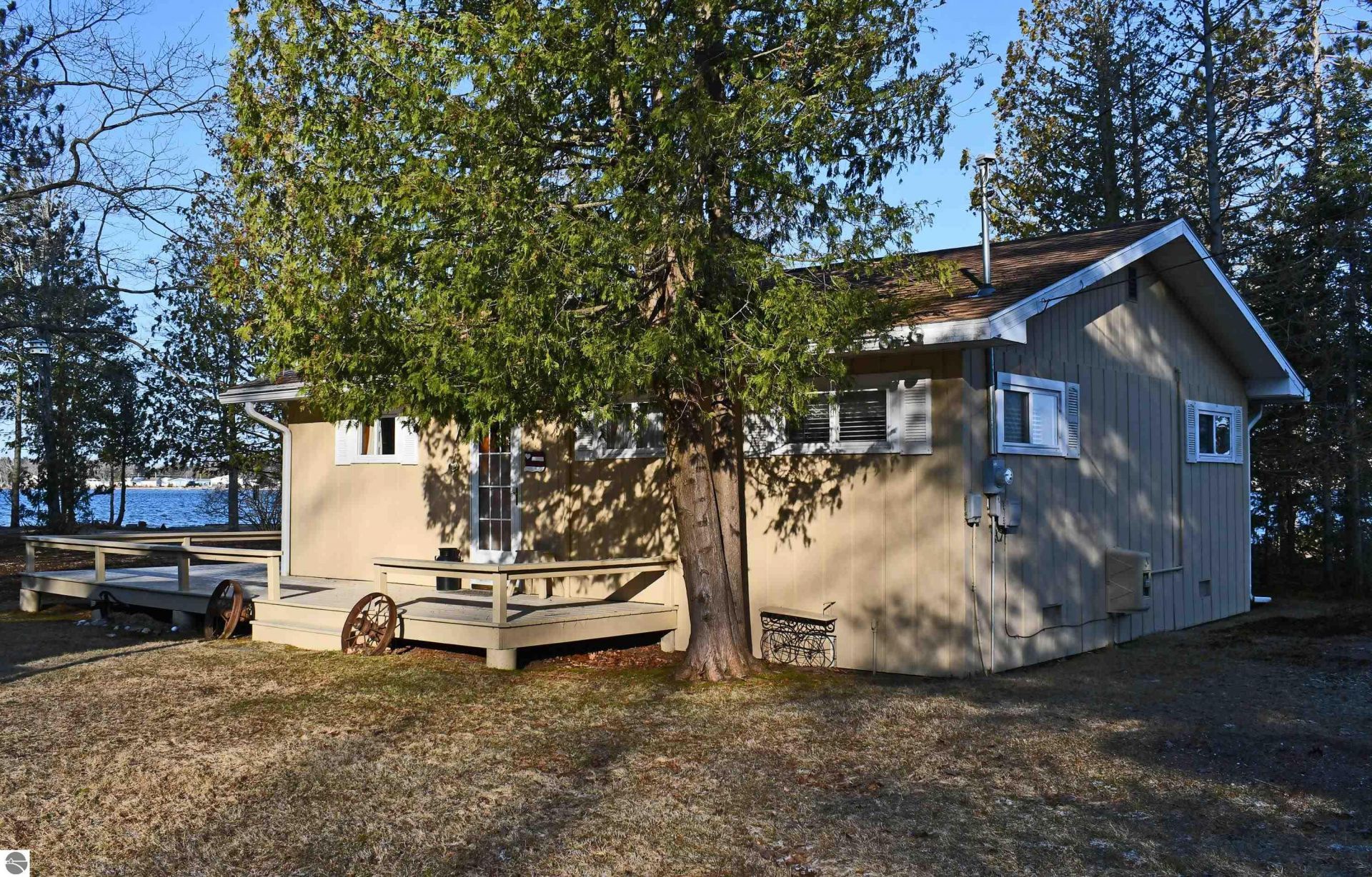 Embrace the Up North lifestyle in this traditional two-bedroom knotty pine cottage in Greenbush. Tucked away on a sprawling double-lot property spanning over an acre, this retreat offers rare privacy and room to breathe with 154 feet of private frontage on Cedar Lake. Inside, the warm knotty pine interior radiates rustic character, centered around a cozy fireplace. The home is equipped with natural gas heat for year-round comfort. Outside, an expansive wrap-around deck provides spectacular, panoramic views of the water, leading to your own sandy beach. The property also includes a detached two-car garage, offering plenty of space for vehicles and water toys. Ideally located for nature lovers, you are just minutes from the pristine shores of Lake Huron and the world-class fishing of the AuSable River.