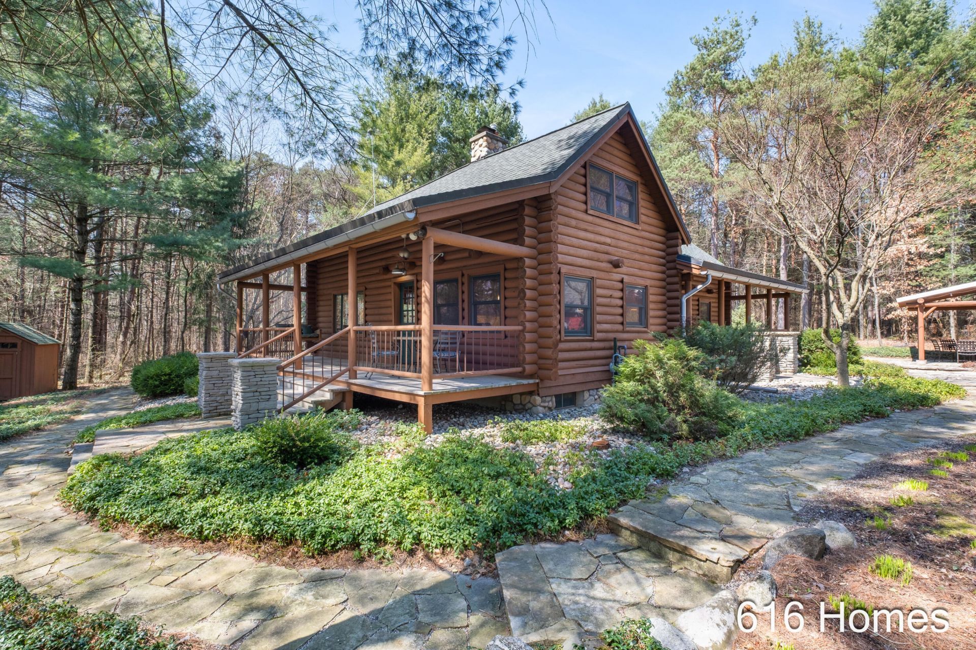 Nestled on a private 1.2-acre wooded retreat, this stunning full log home blends timeless craftsmanship with the advantage of Rockford Schools and Comstock Park Township taxes. Inside, a dramatic two-story living room showcases exposed beams and a striking floor-to-ceiling fireplace crafted from natural stone sourced from the Petoskey area. The eat-in kitchen features granite countertops, stainless steel appliances, and a warm, inviting space for everyday living. The main level also includes a bedroom, full bathroom, and spacious laundry room for convenient main-floor living. Upstairs youll find two additional bedrooms and a beautifully updated full bathroom with a walk-in shower, with the upper level overlooking the impressive living area below. Enjoy the outdoors from multiple covered porch spaces with ceiling fans for added comfort, ideal for relaxing or entertaining. A thoughtfully designed firepit area is set within the beautifully landscaped and well-maintained grounds. The two-story, 3-stall garage offers space for two vehicles along with a versatile upper-level area ideal for a workshop, man cave, or she-shed. A rare opportunity to own a peaceful wooded retreat that blends character, comfort, and convenience.